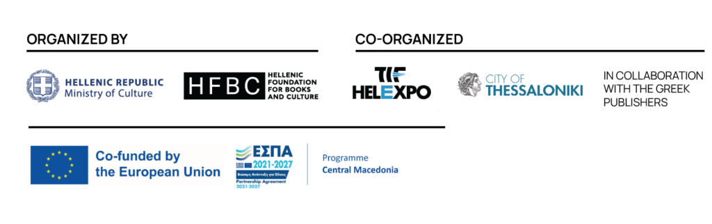 The Thessaloniki International Book Fair (TBF) is organized by the Hellenic Foundation for Books and Culture (HFBC) in collaboration with TIF-HELEXPO, Greek publishers, and the Municipality of Thessaloniki, with the support of the Ministry of Culture and the Region of Central Macedonia. It is co-funded by the European Regional Development Fund under the Central Macedonia ROP 2021-2027. TBF is a member of the International Book Fairs Forum and the ALDUS UP European Book Fairs Network.